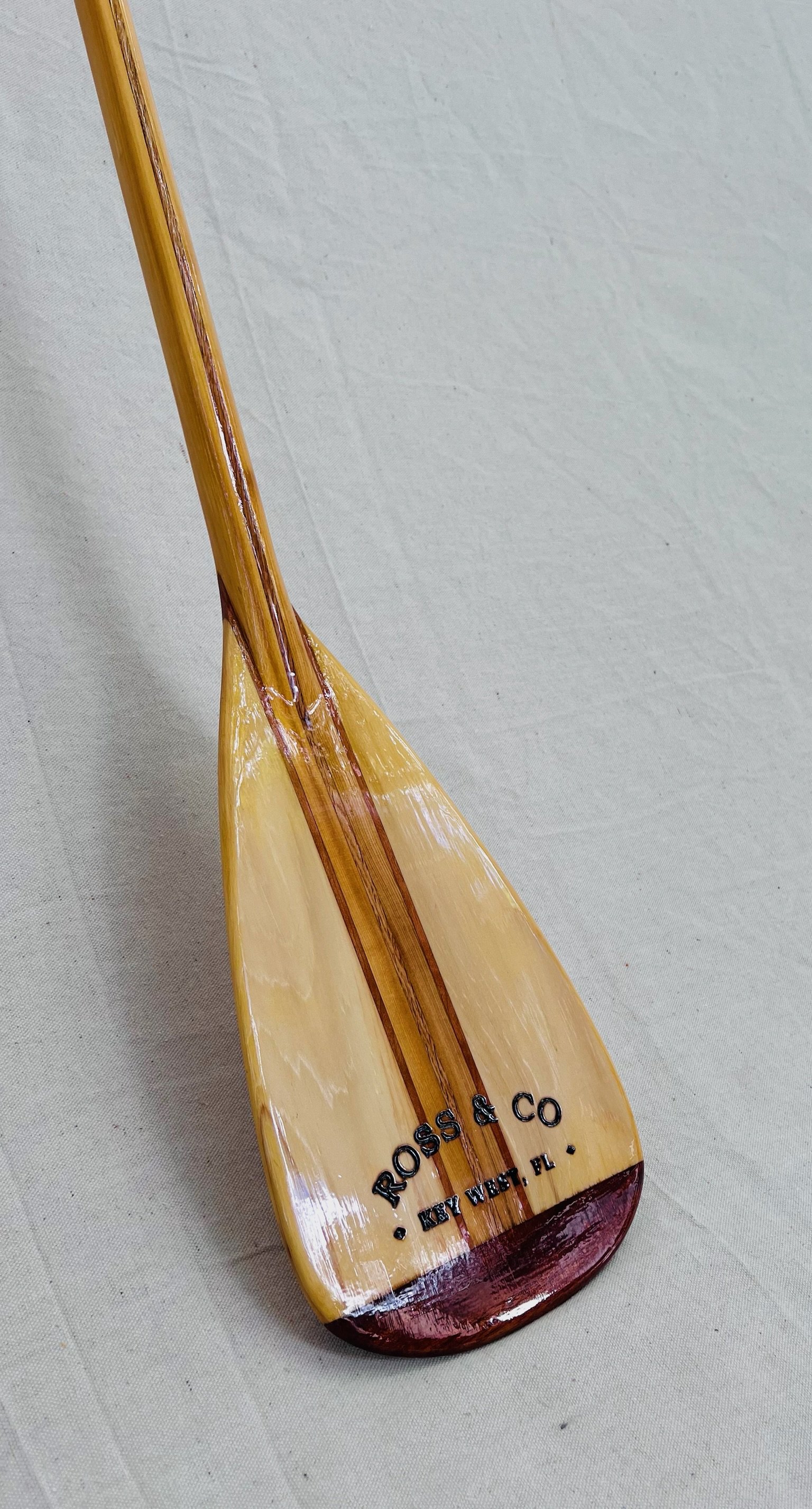 Hand-shaped in Key West Florida, each of our paddles have a 17” blade with a 11° bent shaft. Available in a wide or slim blade style. Multiple species of wood laminated using West-System epoxy are used in each construction. Finished products are varnished with Awlgrip spare varnish while the handles are sealed with teak oil. These beauties are marine ready!